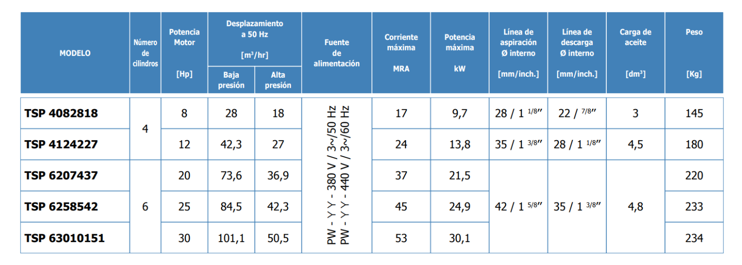 Compresores Doble Etapa Serie TSP Compresores Doble Etapa 8-30 Hp, 28-101m³/h, 50Hz Características Datos técnicos R-404A / R-507 Límites de aplicación Clasificación de modelos